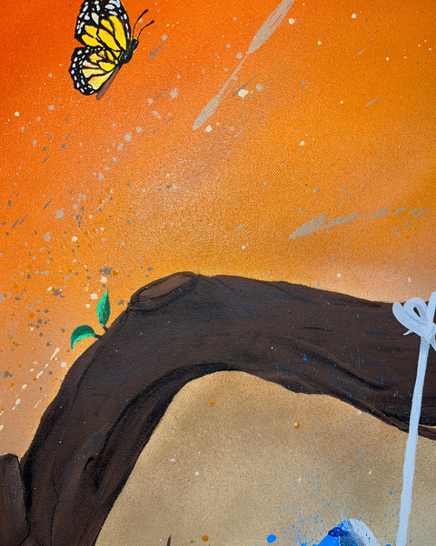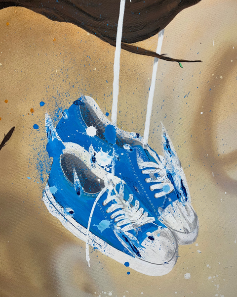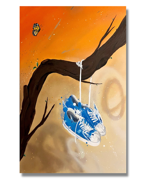Ici, nous avons effectué une réinterprétation de cette pratique en suspendant une paire de chaussure sur une branche d'arbre. Le fond en dégradé de beige vers le orange, représente de façon abstraite un couché de soleil, réalisé entièrement à la bombe. On y retrouve camouflé des "E" et des "O" sous forme de "tag", deux lettres emblématiques pour ces deux artistes. La présence d'un papillon dans le coin gauche représente le symbole de la liberté.